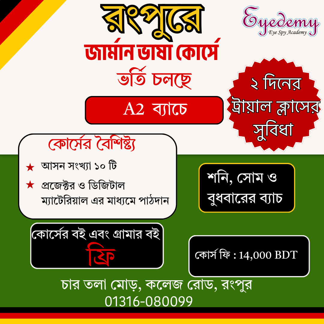 আপনি কি ইতোমধ্যে A1 সম্পন্ন করেছেন এবং এখন জার্মান ভাষার দক্ষতা আরও বাড়াতে চান? Eyedemy – Eye Spy Academy রংপুরে নিয়ে এলো উন্নত মানের German A2 Course। উচ্চশিক্ষা বা কাজের ক্ষেত্রে নিজেকে অন্যদের চেয়ে এগিয়ে রাখতে আজই যুক্ত হোন আমাদের নতুন ব্যাচে।